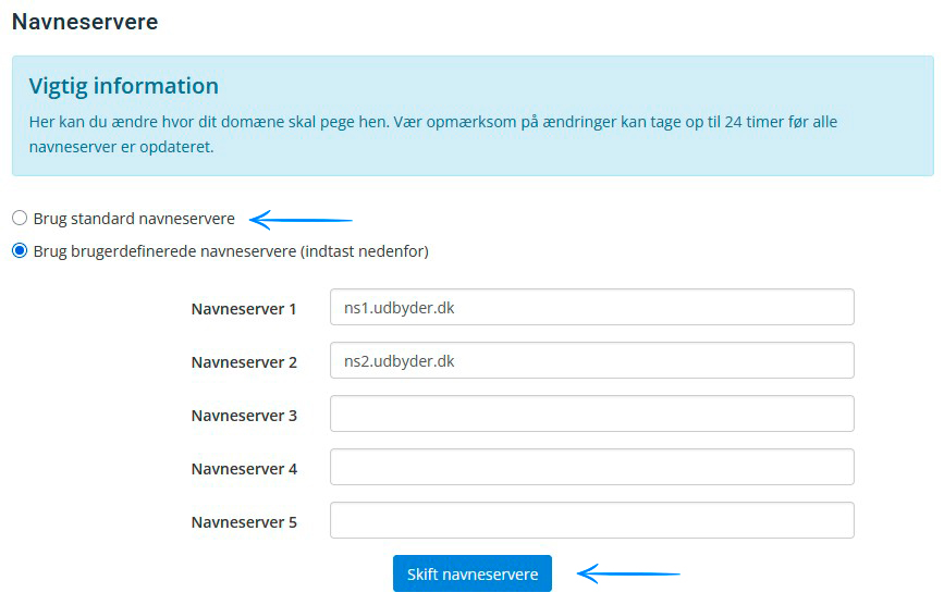 Vælg "Brug standard navneservere " og tryk "Skift navneservere".